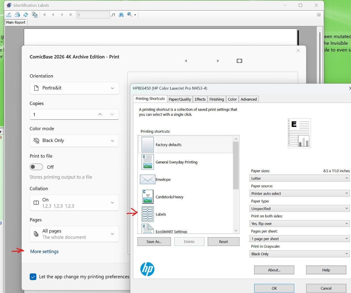I followed you through 'click Preview'. At that point, my system displayed a 'Crystal Report' display of the preview (not a PDF). See first attachment. From that window, I can: A) Click the first icon in top-left corner and save to a file (Crystal Report, PDF, CSV, various Microsoft Excel and Word formants, RTF and XML). B) Click the second icon and Print and it brings up a Print window (this is probably specific to a computer/print you have or it may be a Windows print window). It has a 'More Settings' link which brings up my specific Printer dialog window where I can change to print to labels. See second attachmet. Not sure if any of this will help or not.
