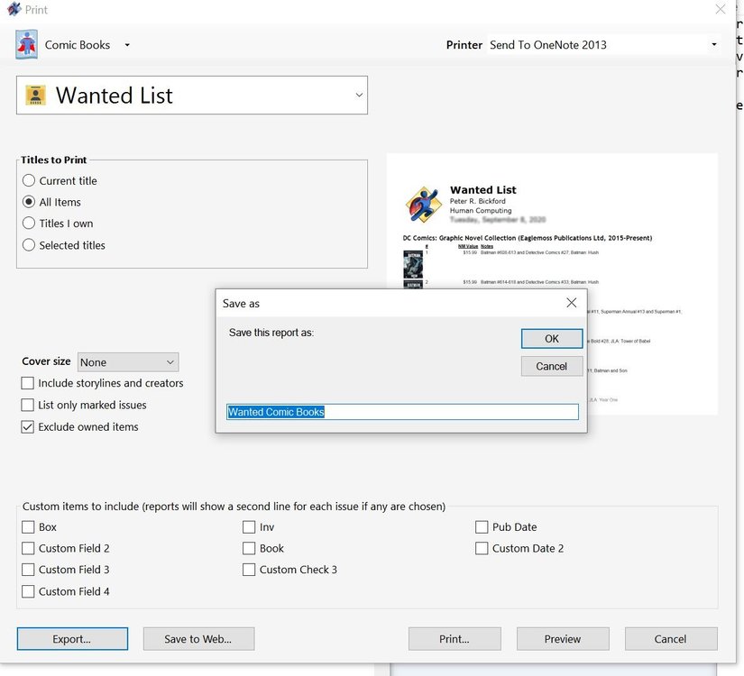 Mark, Using CB 2021 4k Archive v21.0.0.1331, I get the same error without any special options.But they are: Titles to Pring: All items Cover size: None For the next check boxes, only Exclude Owned Items is checked. Then Click EXPORT... Brings up the Save as box and I leave the default name and click OK. Get Message box: Report is being prepared, then the error box is displayed. -