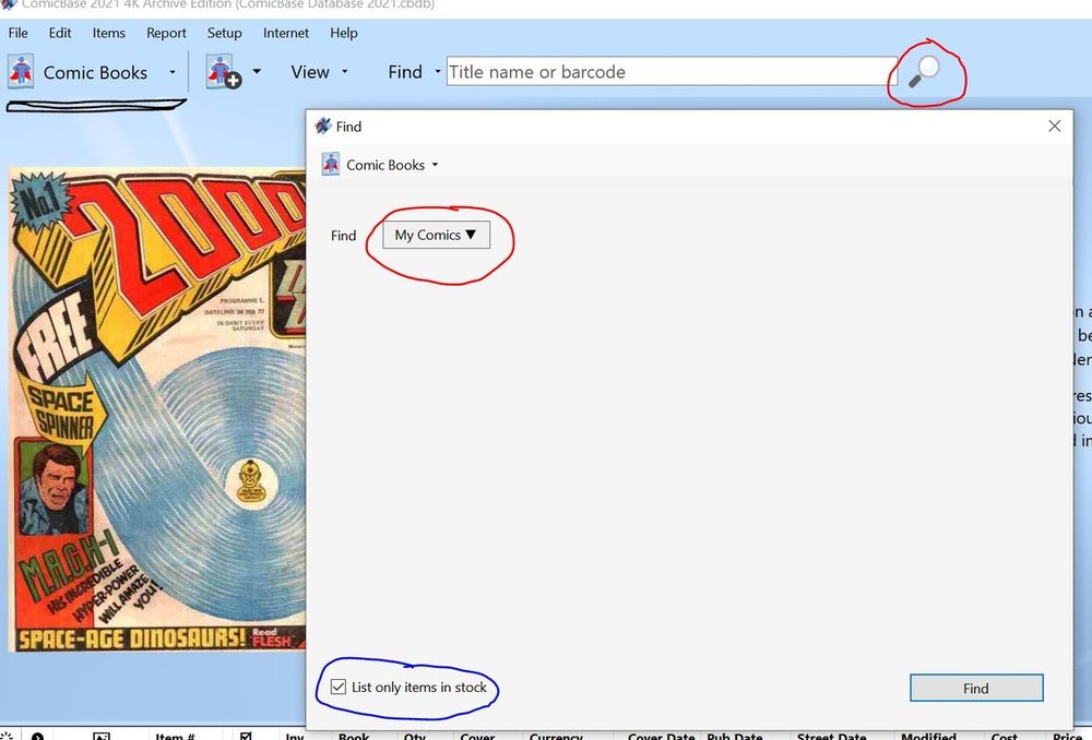 One more thing I meant to mention. The black underline I added is under a drop-down box that lest you switch between Views (Books, Comic Books, Magazines). The Find will only work on one View area at a time. So the Find will get you all your Comic Books but not anything in the Books or Magazine View. You can change your View and run the find in each to get a list for each View. -