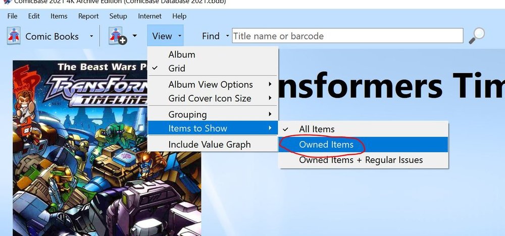 What edition of CB do you have? The Express Edition has about 5,000 covers The Professional Edition has about 50,000 covers The Archive Edition has about 675,000 covers With about 60,000 Titles that works out to: Express has 1 cover for every 12 Titles on average Pro has 1 cover for every 1.2 Titles on average Archive has 11.25 Cover per Title on average. My guess is you have the Pro Edition which will only have 1 or 2 covers per Title. ===== For you other question, The default database that opens is ready to go. As you stated, you can use a barcode scanner using the menu Items->Add by Barcode option. At the least, all that needs to be done is go to the Title you want to add a comic, scroll down that the issue (if needed), and change the value under QTY (Quantity in Stock) from a 0 to a 1 (assuming you only have 1 Issue. It could be 2 or more if you have multiples). At that point, you have an item in the database. That is all that is needed. You can also, change other things, like Condition, Cost, Notes, any Custom Columns you may define, etc. ===== There are a few ways to find what you have entered already. One quick way is to bring up the Titles window by: Clicking on the icon between the two arrows in the top right corner, or pressing CTRL+T. When the Titles window comes up, click on the radio button by Titles In Stock. At that point, the list of Titles below will ONLY be ones you have QTY >= 1 for any Issue. Another way is to use the View button at the top (to the left of the text input box) and select Items to Show->Owned Items. At this point, when you scroll through the Titles (you can do this with the Arrow buttons in the top left corner), all that will be displayed are items with QTY >-= 1 (i.e. items you own). NOTE: Don't forget about setting what to View as it can be confusing if you are tying to find Titles you don't own. =====