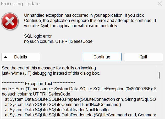 Recently installed 2026 version, and opened for the first time, ran the Check for Updates and proceed to get this error, every time. Screengrab attached. Then this is the error code that displays in the details. ----------------------------------------- See the end of this message for details on invoking just-in-time (JIT) debugging instead of this dialog box. ************** Exception Text ************** code = Error (1), message = System.Data.SQLite.SQLiteException (0x800007BF): SQL logic error no such column: UT.PRHSeriesCode at System.Data.SQLite.SQLite3.Prepare(SQLiteConnection cnn, String strSql, SQLiteStatement previous, UInt32 timeoutMS, String& strRemain) at System.Data.SQLite.SQLiteCommand.BuildNextCommand() at System.Data.SQLite.SQLiteDataReader.NextResult() at System.Data.SQLite.SQLiteDataReader..ctor(SQLiteCommand cmd, CommandBehavior behave) at System.Data.SQLite.SQLiteCommand.ExecuteReader(CommandBehavior behavior) at System.Data.Common.DbCommand.ExecuteDbDataReaderAsync(CommandBehavior behavior, CancellationToken cancellationToken) --- End of stack trace from previous location where exception was thrown --- at System.Runtime.ExceptionServices.ExceptionDispatchInfo.Throw() at System.Runtime.CompilerServices.TaskAwaiter.HandleNonSuccessAndDebuggerNotification(Task task) at ProjectX.ContentUpdates.VB$StateMachine_60_ProcessSQLChangedBookTitlesAsync.MoveNext() --- End of stack trace from previous location where exception was thrown --- at System.Runtime.ExceptionServices.ExceptionDispatchInfo.Throw() at System.Runtime.CompilerServices.TaskAwaiter.HandleNonSuccessAndDebuggerNotification(Task task) at ProjectX.ContentUpdates.VB$StateMachine_64_UpdateSQLBookTitlesAsync.MoveNext() --- End of stack trace from previous location where exception was thrown --- at System.Runtime.ExceptionServices.ExceptionDispatchInfo.Throw() at System.Runtime.CompilerServices.TaskAwaiter.HandleNonSuccessAndDebuggerNotification(Task task) at ProjectX.ContentUpdates.VB$StateMachine_10_ProcessLoadedSQLUpdateAsync.MoveNext() --- End of stack trace from previous location where exception was thrown --- at System.Runtime.ExceptionServices.ExceptionDispatchInfo.Throw() at System.Runtime.CompilerServices.TaskAwaiter.HandleNonSuccessAndDebuggerNotification(Task task) at ProjectX.ContentUpdates.VB$StateMachine_9_UpdateDatabaseAsync.MoveNext() --- End of stack trace from previous location where exception was thrown --- at System.Runtime.ExceptionServices.ExceptionDispatchInfo.Throw() at System.Runtime.CompilerServices.TaskAwaiter.HandleNonSuccessAndDebuggerNotification(Task task) at ProjectX.ContentUpdates.VB$StateMachine_7_DoContentUpdateAsync.MoveNext() --- End of stack trace from previous location where exception was thrown --- at System.Runtime.ExceptionServices.ExceptionDispatchInfo.Throw() at System.Runtime.CompilerServices.TaskAwaiter.HandleNonSuccessAndDebuggerNotification(Task task) at ProjectX.Globals.VB$StateMachine_536_CheckForUpdatesAsync.MoveNext() --- End of stack trace from previous location where exception was thrown --- at System.Runtime.ExceptionServices.ExceptionDispatchInfo.Throw() at System.Runtime.CompilerServices.TaskAwaiter.HandleNonSuccessAndDebuggerNotification(Task task) at ProjectX.FrmMain.VB$StateMachine_203_CheckForUpdatesToolStripMenuItem_Click.MoveNext() --- End of stack trace from previous location where exception was thrown --- at System.Runtime.ExceptionServices.ExceptionDispatchInfo.Throw() ************** Loaded Assemblies ************** mscorlib Assembly Version: 4.0.0.0 Win32 Version: 4.8.9323.0 built by: NET481REL1LAST_25H2_C CodeBase: file:///C:/Windows/Microsoft.NET/Framework64/v4.0.30319/mscorlib.dll ---------------------------------------- ComicBase 2026 4K Archive Edition Assembly Version: 26.0.9.3234 Win32 Version: 26.0.9.3234 CodeBase: file:///C:/Program%20Files/Human%20Computing/ComicBase%202026%204K%20Archive%20Edition/ComicBase%202026%204K%20Archive%20Edition.exe ---------------------------------------- Microsoft.VisualBasic Assembly Version: 10.0.0.0 Win32 Version: 14.8.9221.0 built by: NET481REL1LAST_25H2 CodeBase: file:///C:/WINDOWS/Microsoft.Net/assembly/GAC_MSIL/Microsoft.VisualBasic/v4.0_10.0.0.0__b03f5f7f11d50a3a/Microsoft.VisualBasic.dll ---------------------------------------- System Assembly Version: 4.0.0.0 Win32 Version: 4.8.9321.0 built by: NET481REL1LAST_25H2_B CodeBase: file:///C:/WINDOWS/Microsoft.Net/assembly/GAC_MSIL/System/v4.0_4.0.0.0__b77a5c561934e089/System.dll ---------------------------------------- System.Core Assembly Version: 4.0.0.0 Win32 Version: 4.8.9319.0 built by: NET481REL1LAST_25H2_B CodeBase: file:///C:/WINDOWS/Microsoft.Net/assembly/GAC_MSIL/System.Core/v4.0_4.0.0.0__b77a5c561934e089/System.Core.dll ---------------------------------------- System.Windows.Forms Assembly Version: 4.0.0.0 Win32 Version: 4.8.9221.0 built by: NET481REL1LAST_25H2 CodeBase: file:///C:/WINDOWS/Microsoft.Net/assembly/GAC_MSIL/System.Windows.Forms/v4.0_4.0.0.0__b77a5c561934e089/System.Windows.Forms.dll ---------------------------------------- System.Drawing Assembly Version: 4.0.0.0 Win32 Version: 4.8.9221.0 built by: NET481REL1LAST_25H2 CodeBase: file:///C:/WINDOWS/Microsoft.Net/assembly/GAC_MSIL/System.Drawing/v4.0_4.0.0.0__b03f5f7f11d50a3a/System.Drawing.dll ---------------------------------------- System.Configuration Assembly Version: 4.0.0.0 Win32 Version: 4.8.9221.0 built by: NET481REL1LAST_25H2 CodeBase: file:///C:/WINDOWS/Microsoft.Net/assembly/GAC_MSIL/System.Configuration/v4.0_4.0.0.0__b03f5f7f11d50a3a/System.Configuration.dll ---------------------------------------- System.Xml Assembly Version: 4.0.0.0 Win32 Version: 4.8.9221.0 built by: NET481REL1LAST_25H2 CodeBase: file:///C:/WINDOWS/Microsoft.Net/assembly/GAC_MSIL/System.Xml/v4.0_4.0.0.0__b77a5c561934e089/System.Xml.dll ---------------------------------------- System.Runtime.Remoting Assembly Version: 4.0.0.0 Win32 Version: 4.8.9221.0 built by: NET481REL1LAST_25H2 CodeBase: file:///C:/WINDO